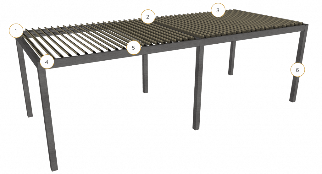 Industrial strength structural aluminum is used on our framing extrusions to ensure the most dependable and sturdy structures on the market. Our 6×6 posts and 2×8 or 4×8 beams are standard with other options available for higher demand situations. Suncoast louver blades are the widest available at 8 inches and can span an impressive 15 feet per zone.