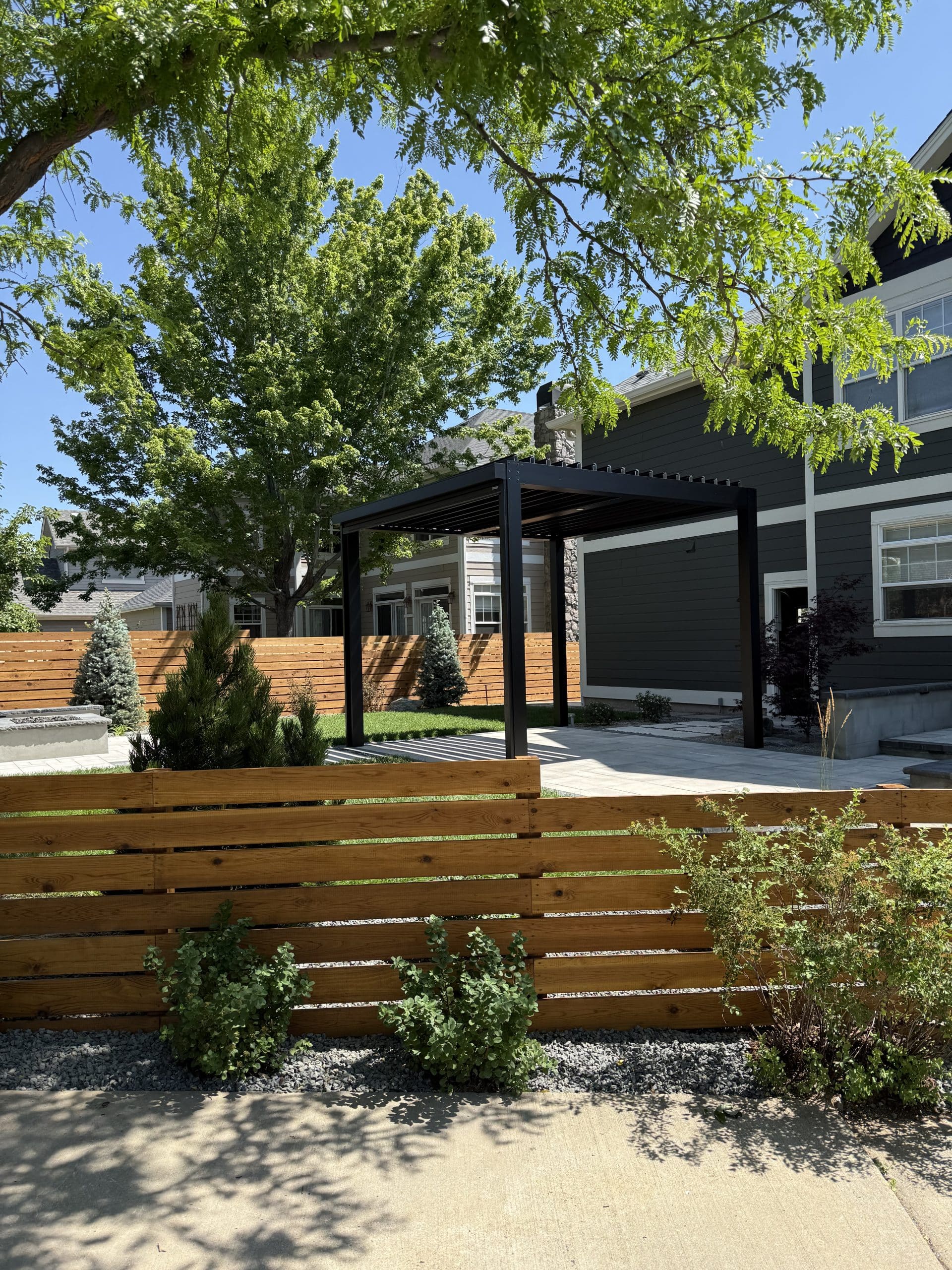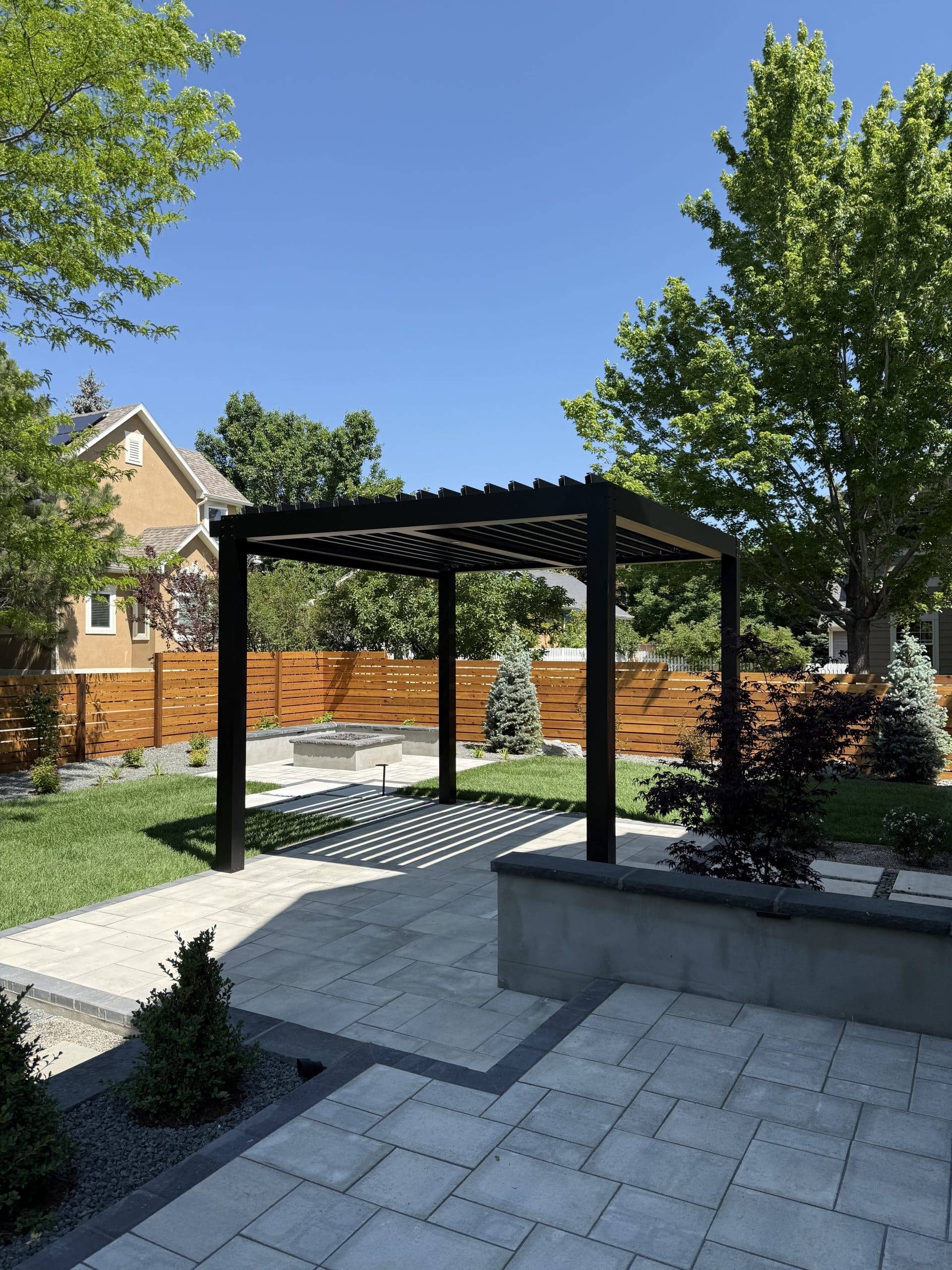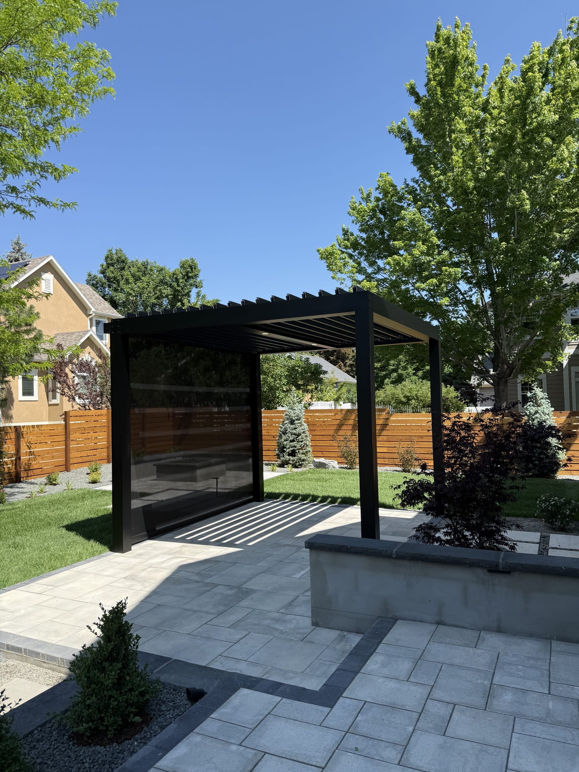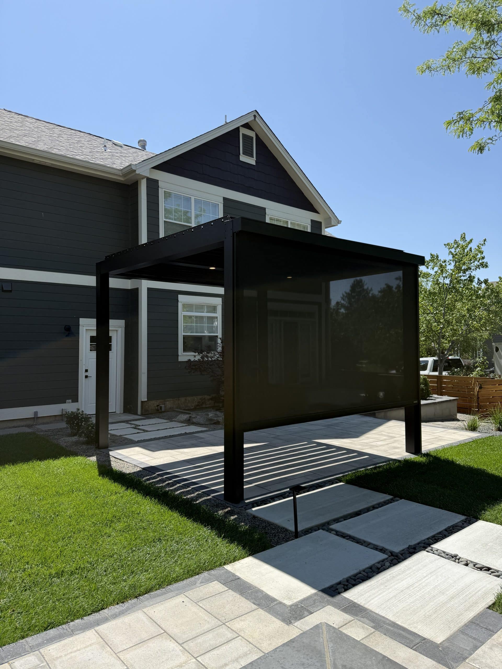 This custom outdoor living enhancement project, completed by Suncoast Enclosures, transforms a paver patio into a versatile, all-season space. The installation features a freestanding louvered structure paired with an advanced motorized retractable screen for sun protection and integrated lighting, designed for optimal comfort, privacy, and aesthetics.