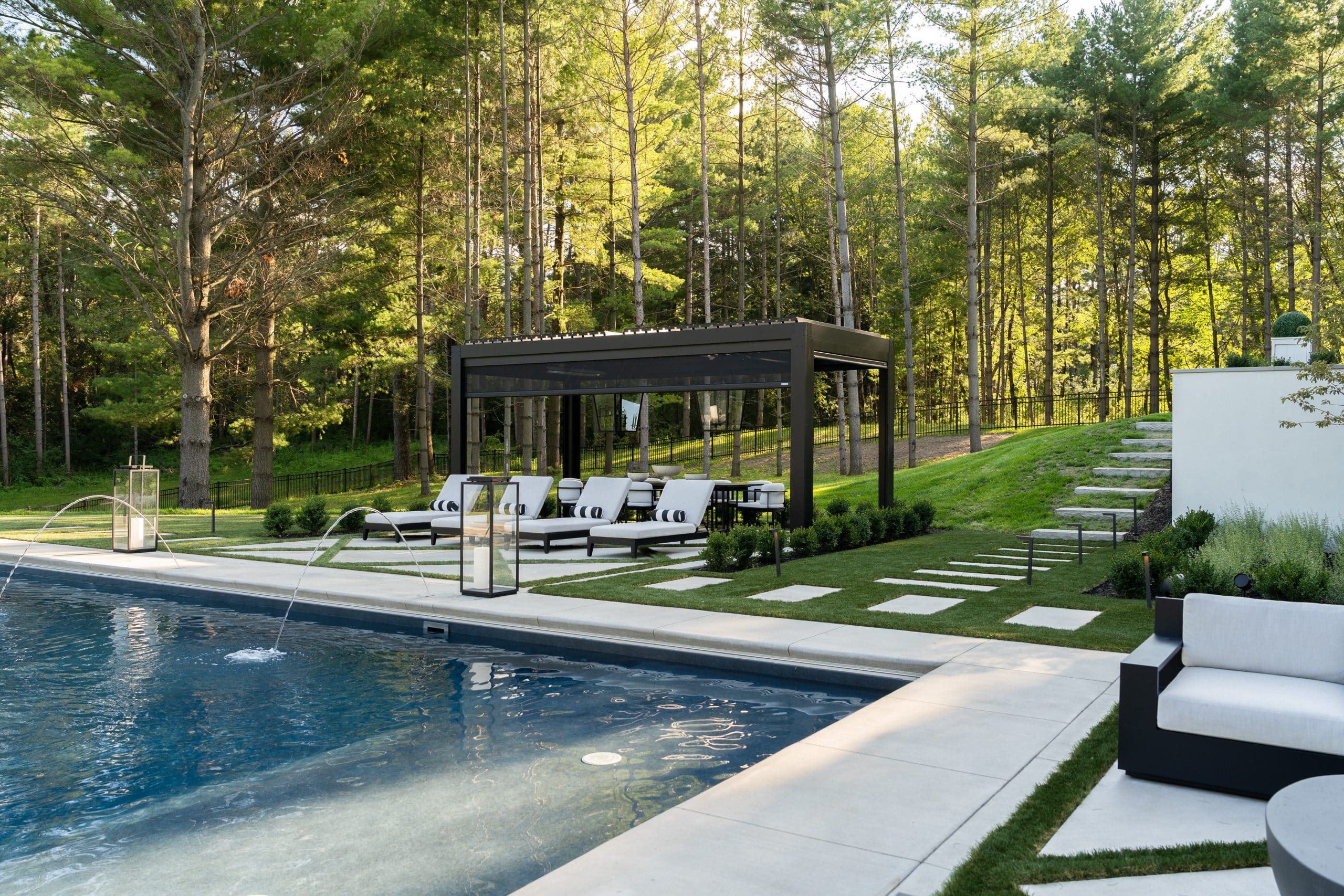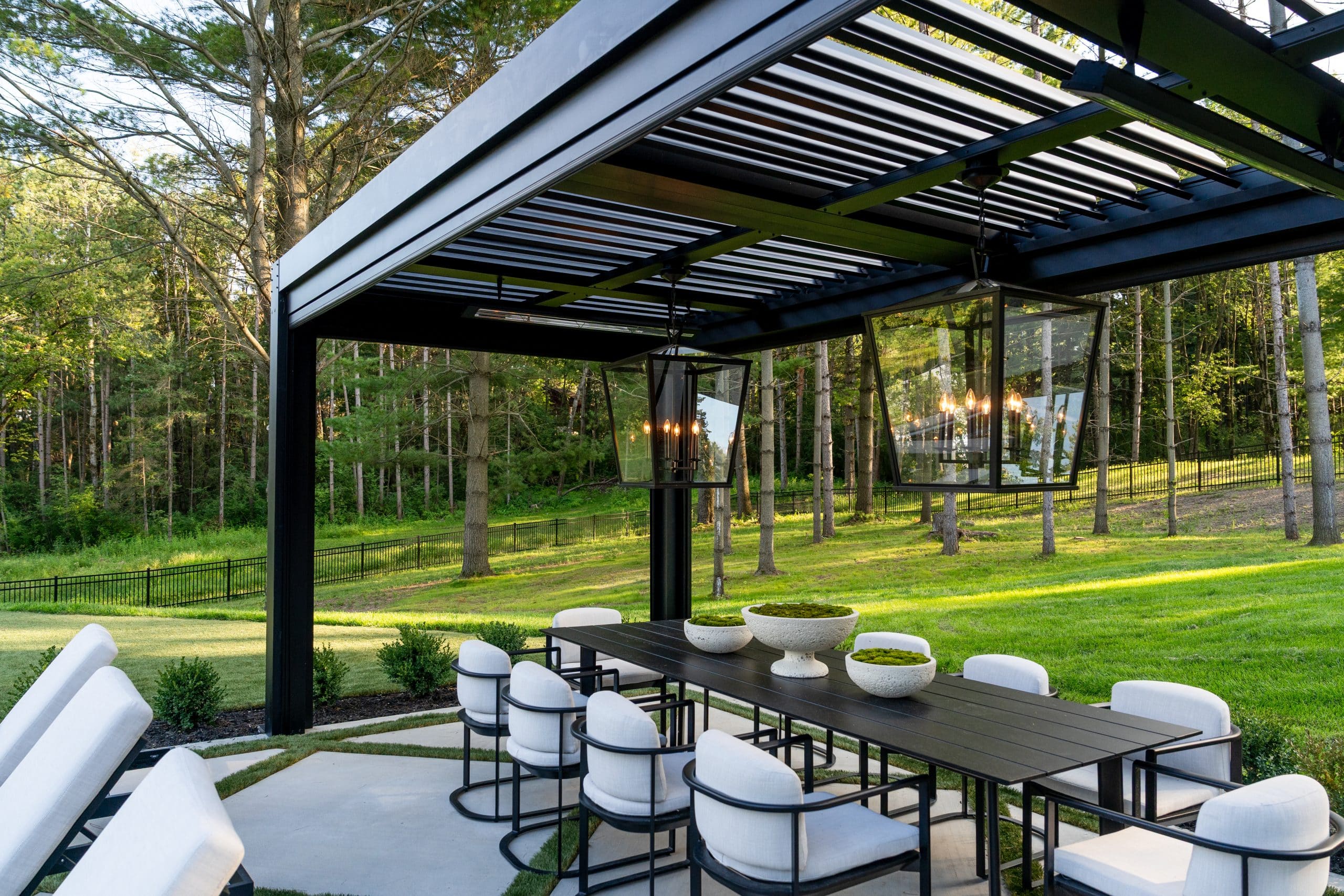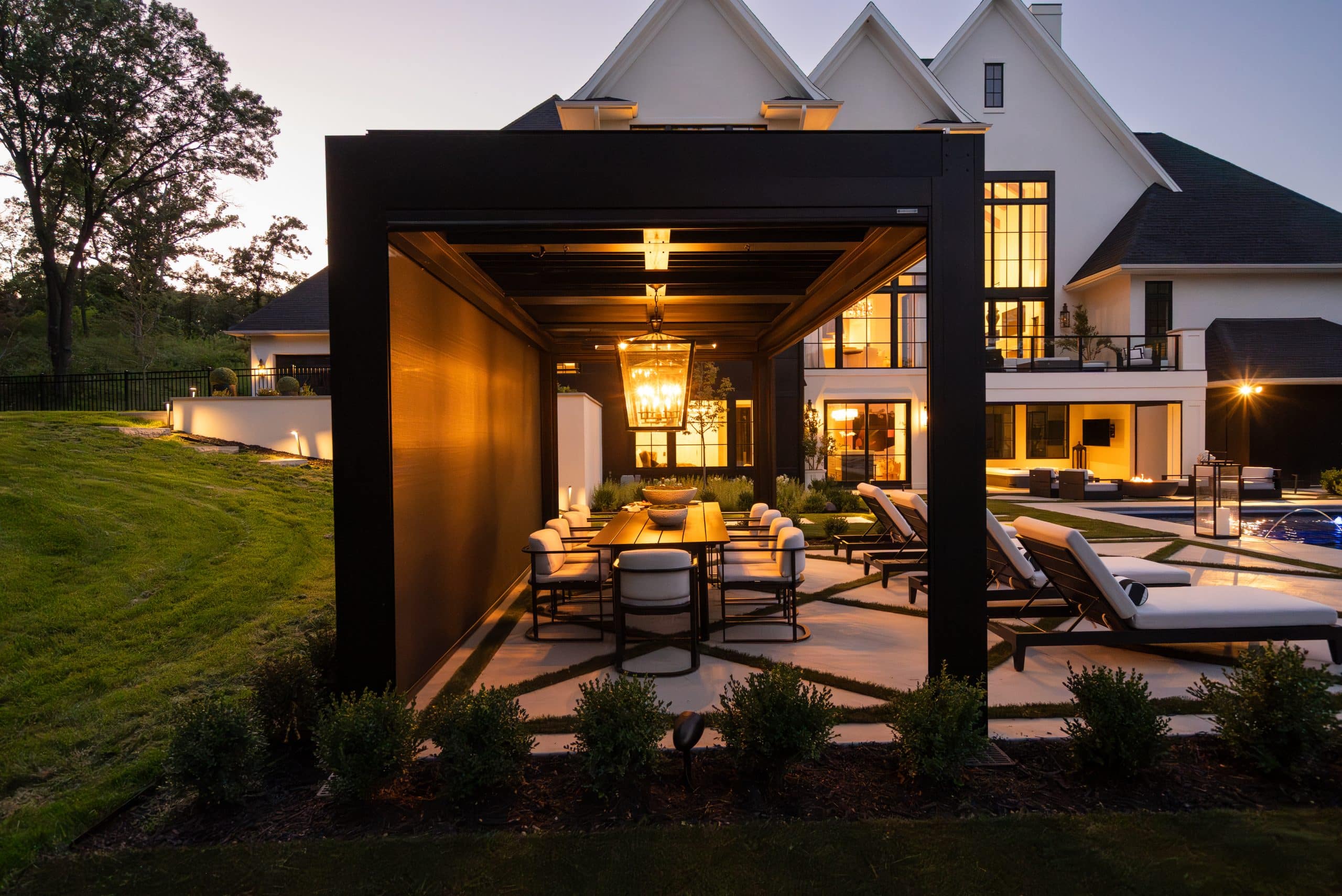 Expanded entertainment space by the pool with this louvered roof structure with retractable screens to block rain and wind when dining.