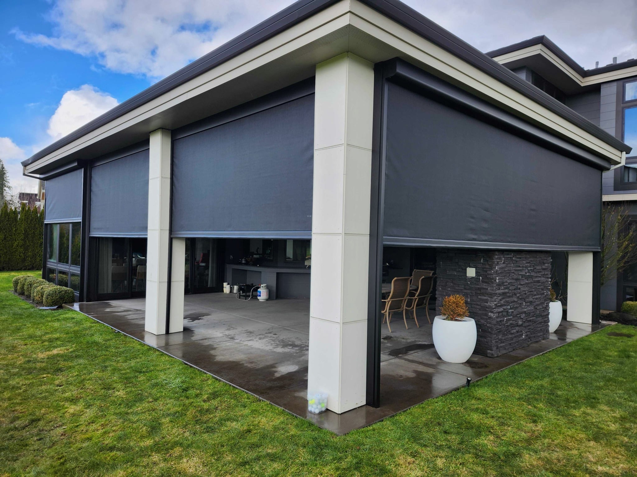 The retractable power screens completely enclose this patio space completely insulating the owners from the bugs, sun and any foul weather.