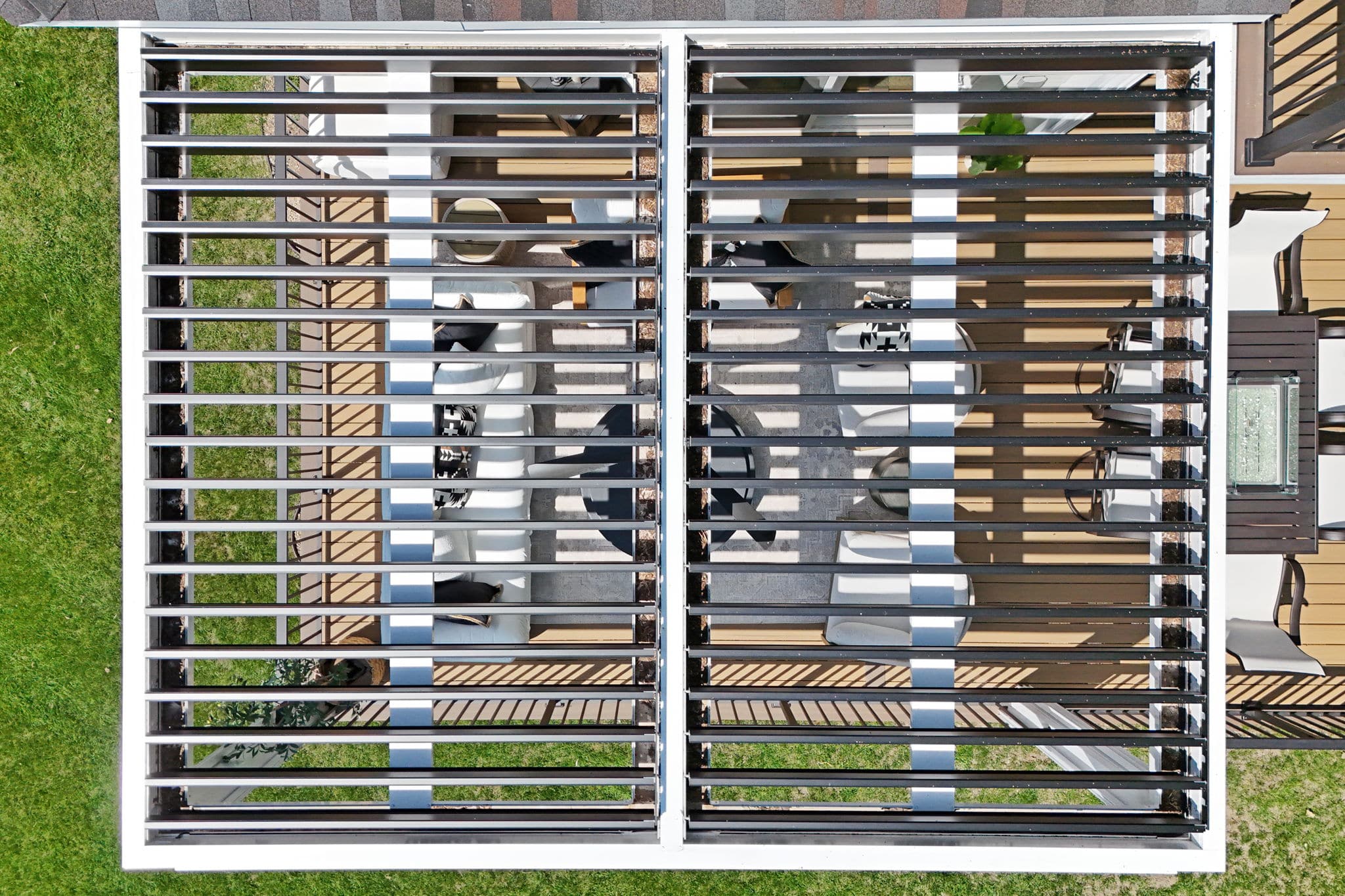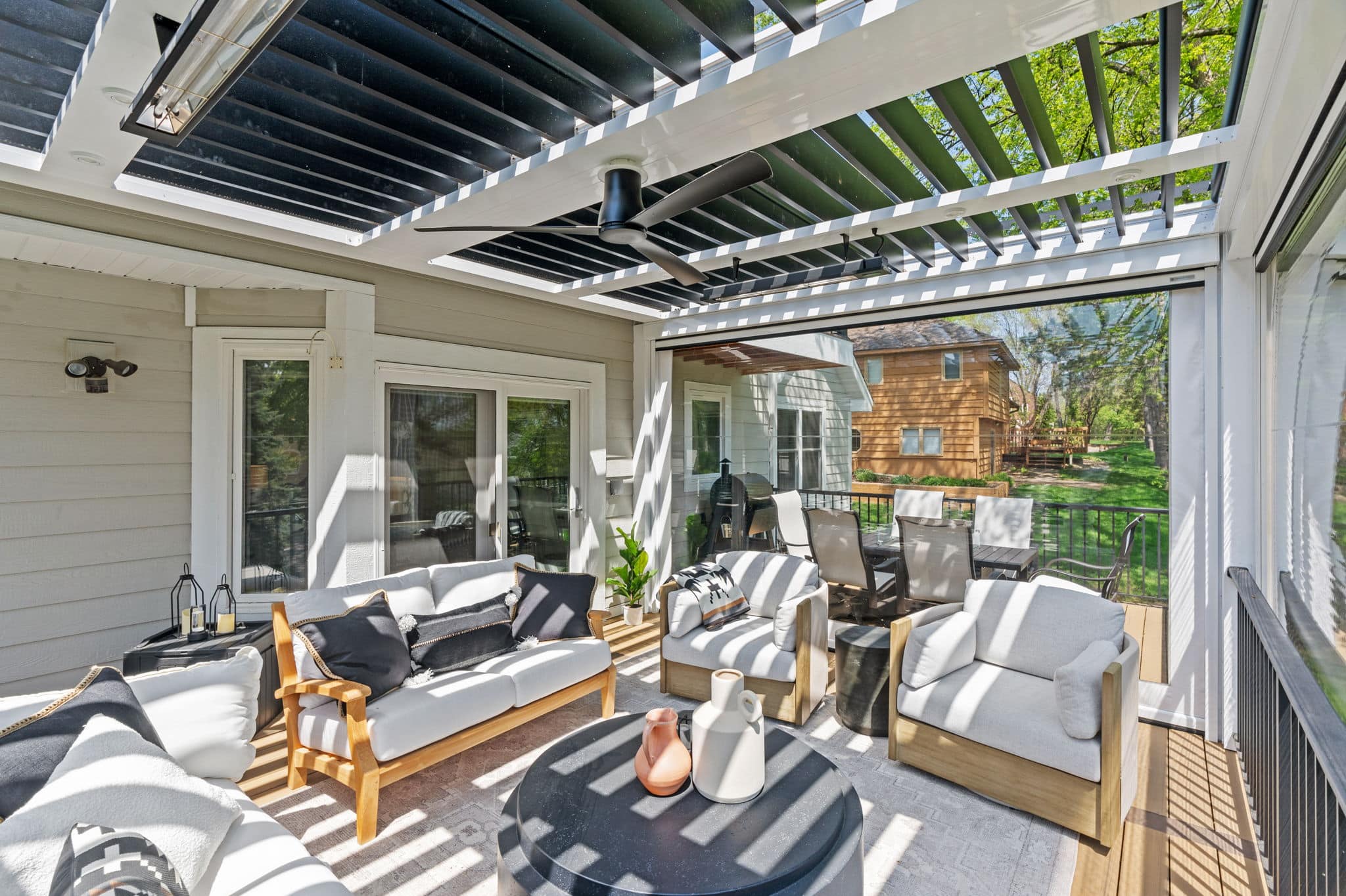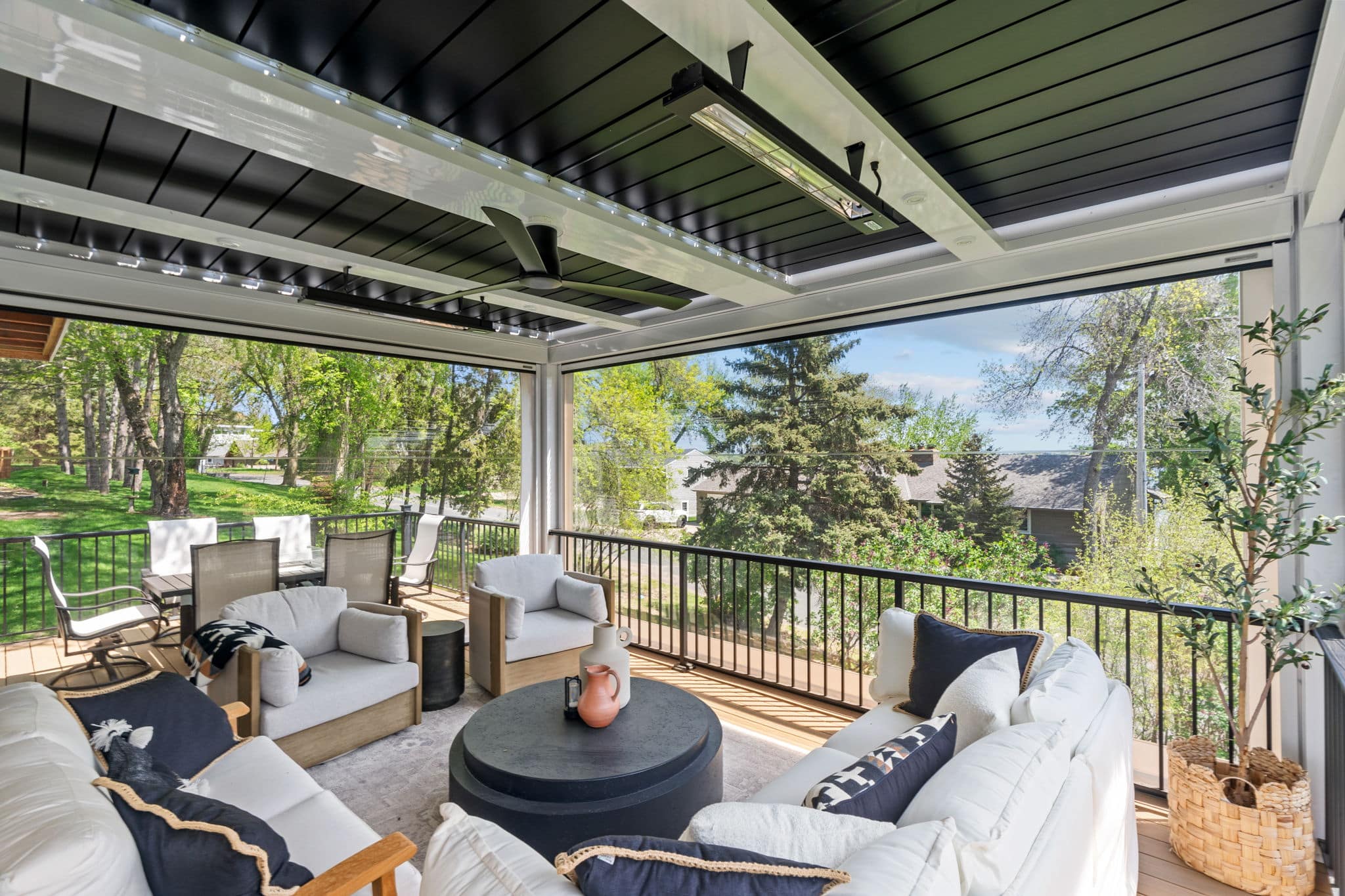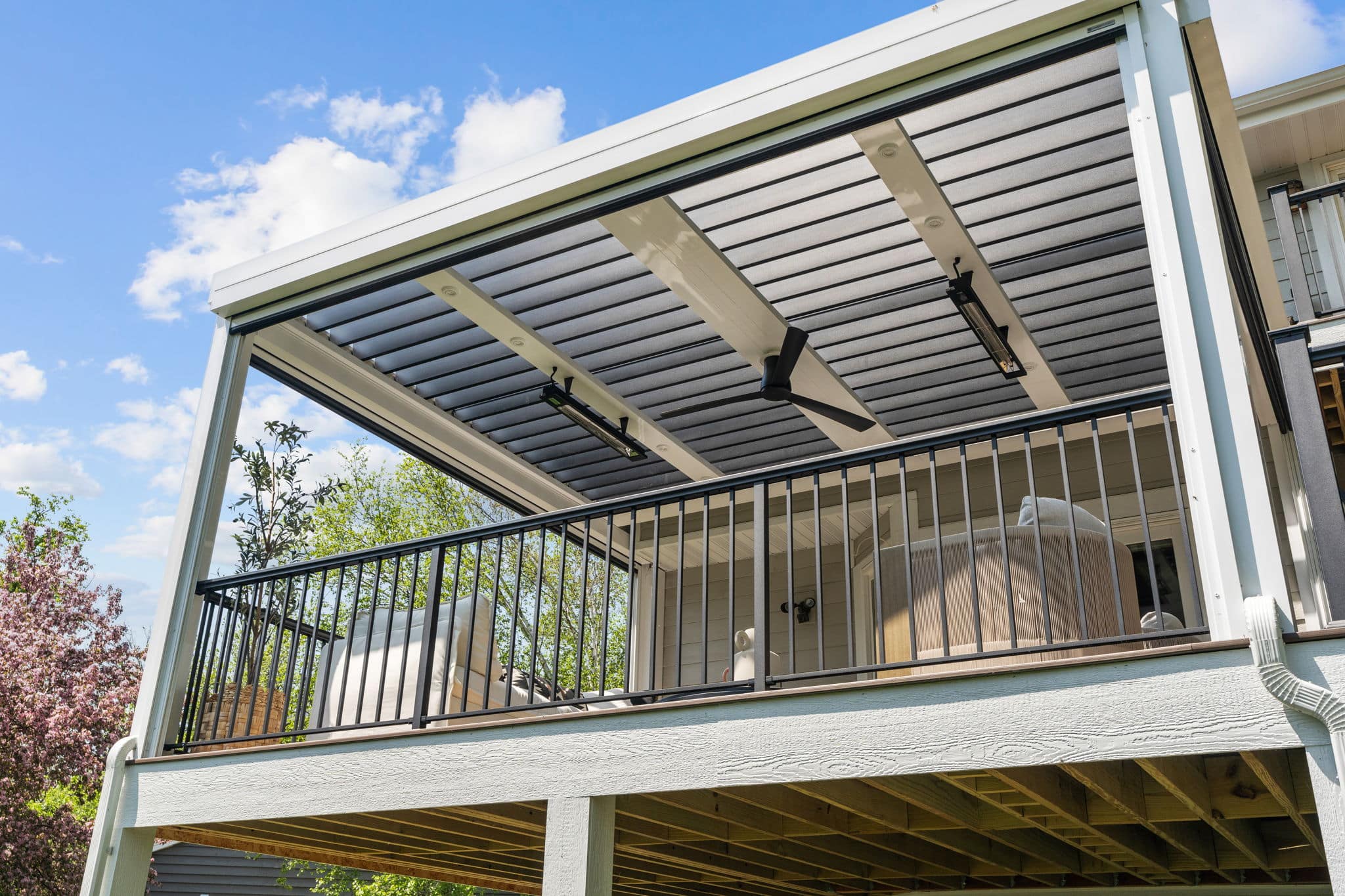 This upper level louvered roof project required working around existing structural elements such as a small 3rd floor deck. We matched the existing trim color to the support beams and used a black contracting louver to create a cohesive outdoor space. Motorized retractable screens allow for complete blocking of rain and wind while allowing for flexibility and privacy for the space.