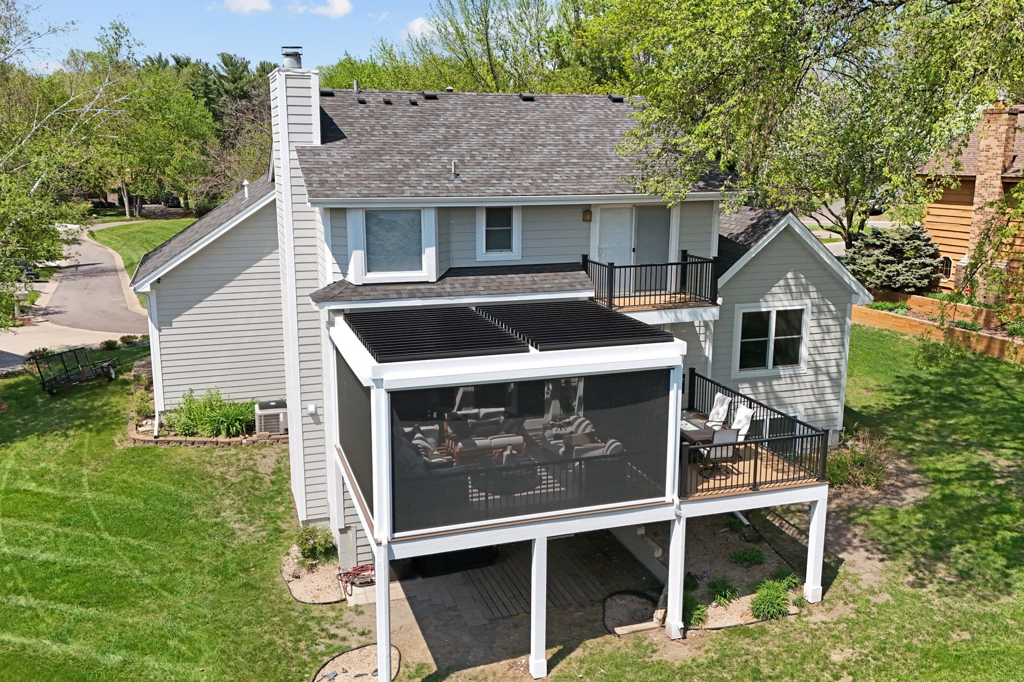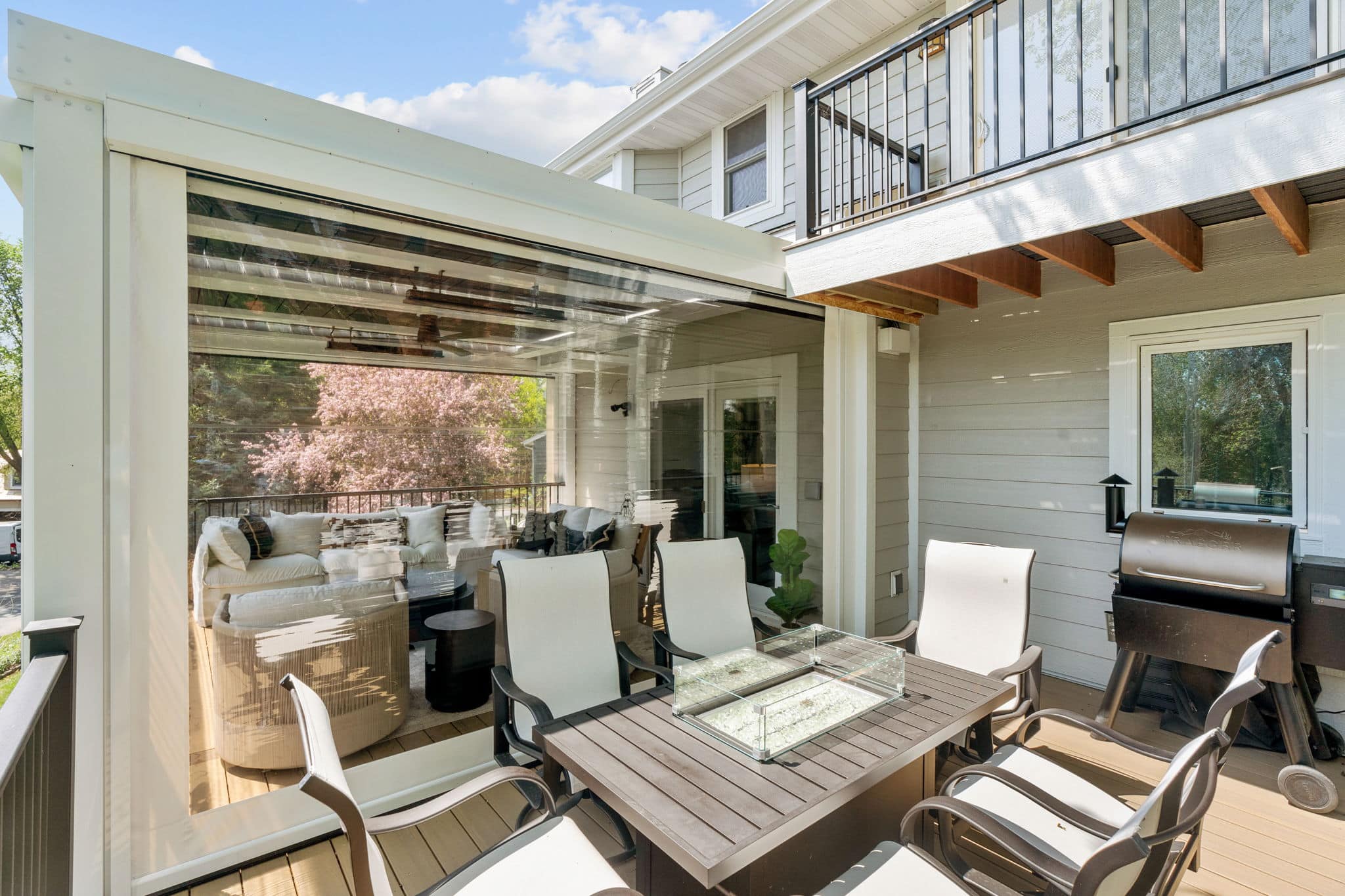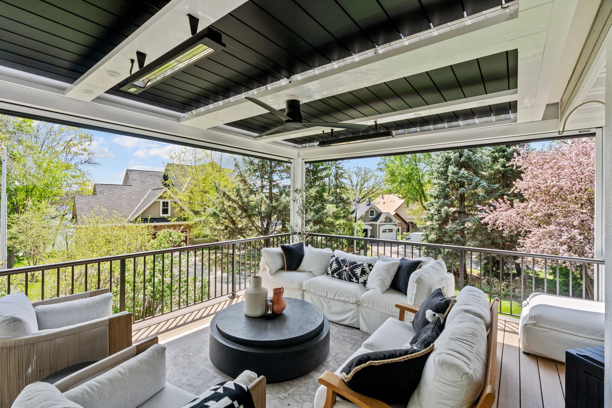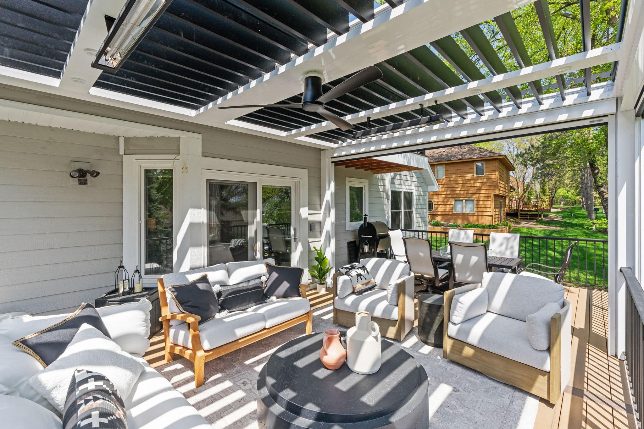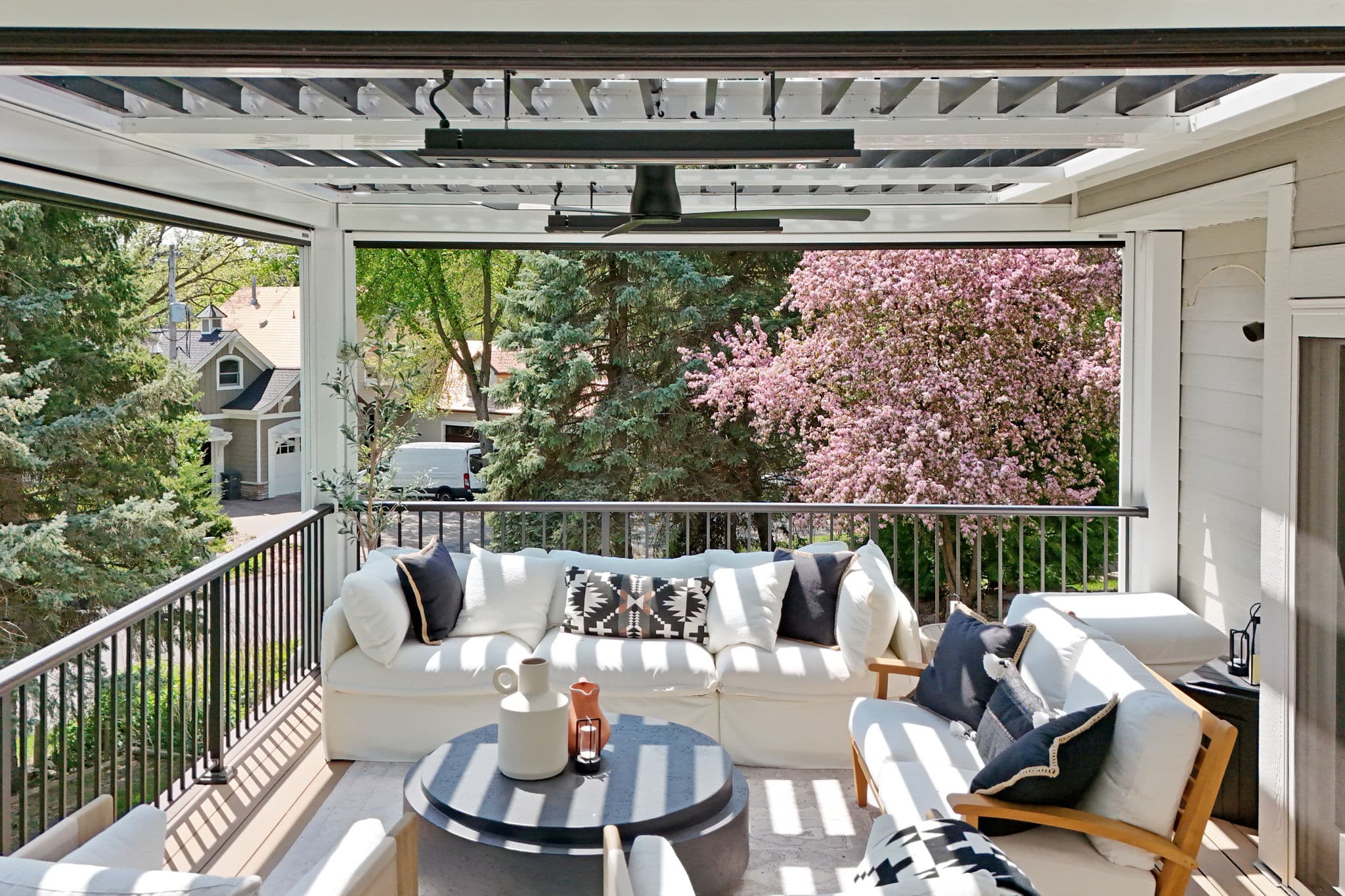 This upper level louvered roof project required working around existing structural elements such as a small 3rd floor deck. We matched the existing trim color to the support beams and used a black contracting louver to create a cohesive outdoor space. Motorized retractable screens allow for complete blocking of rain and wind while allowing for flexibility and privacy for the space.