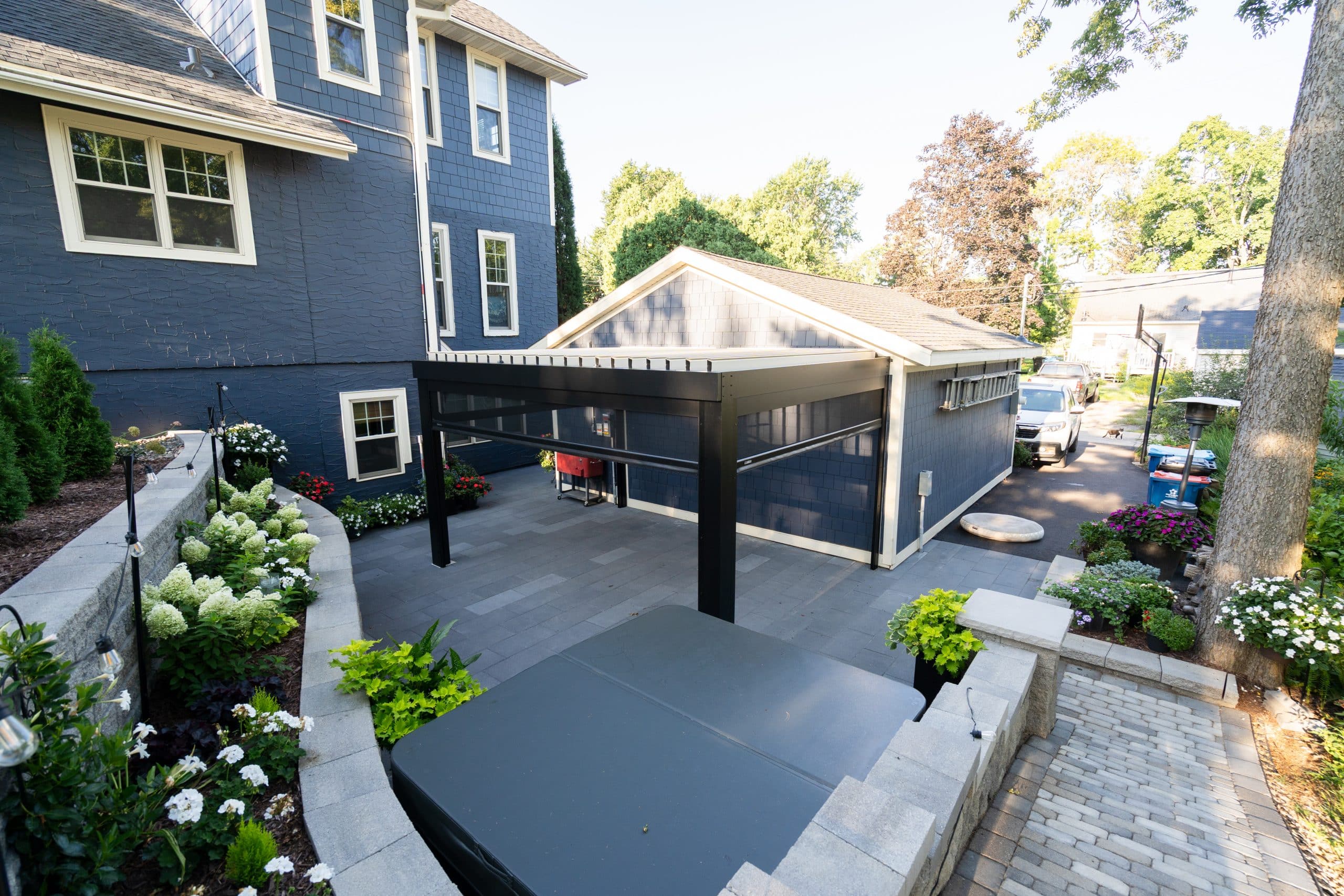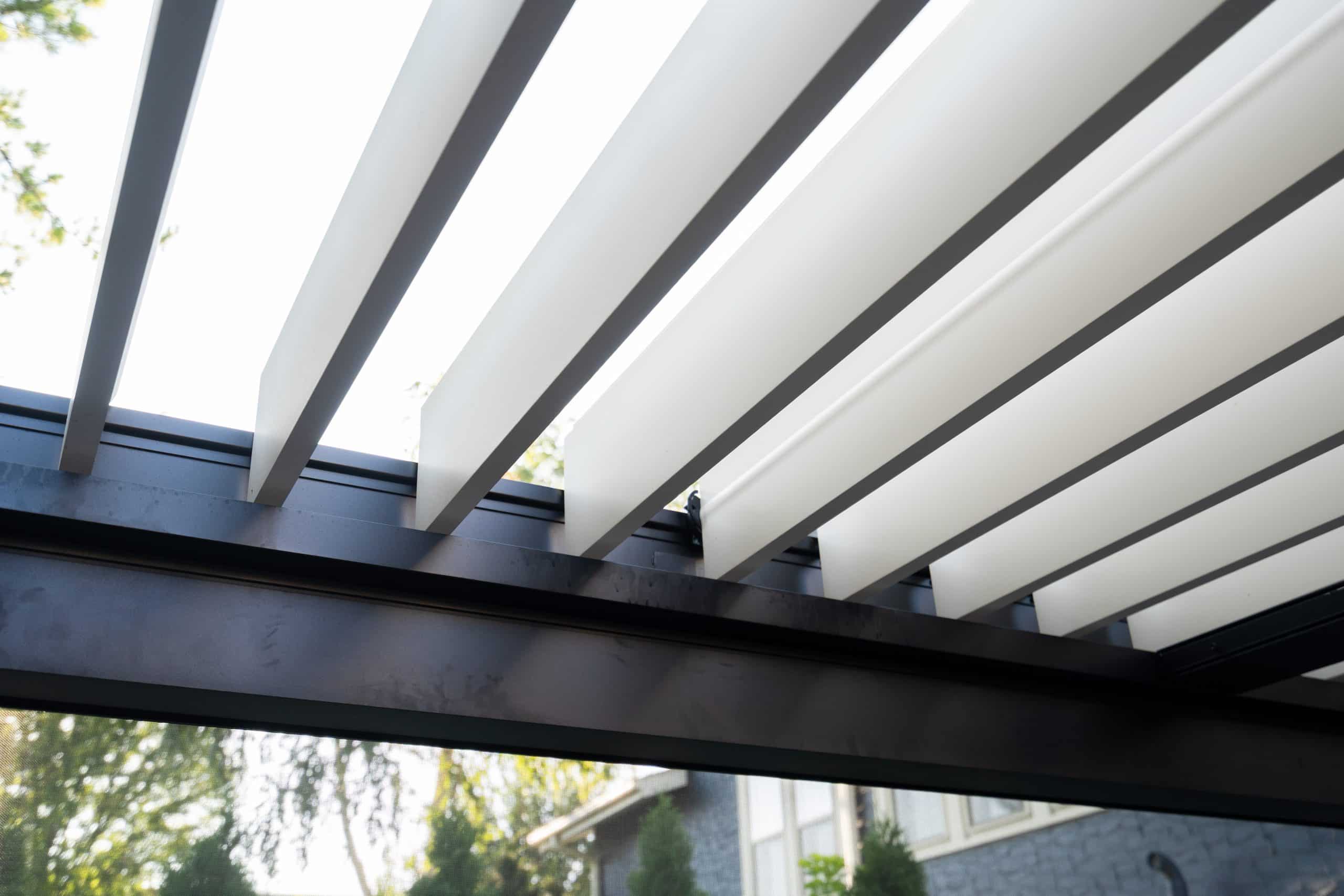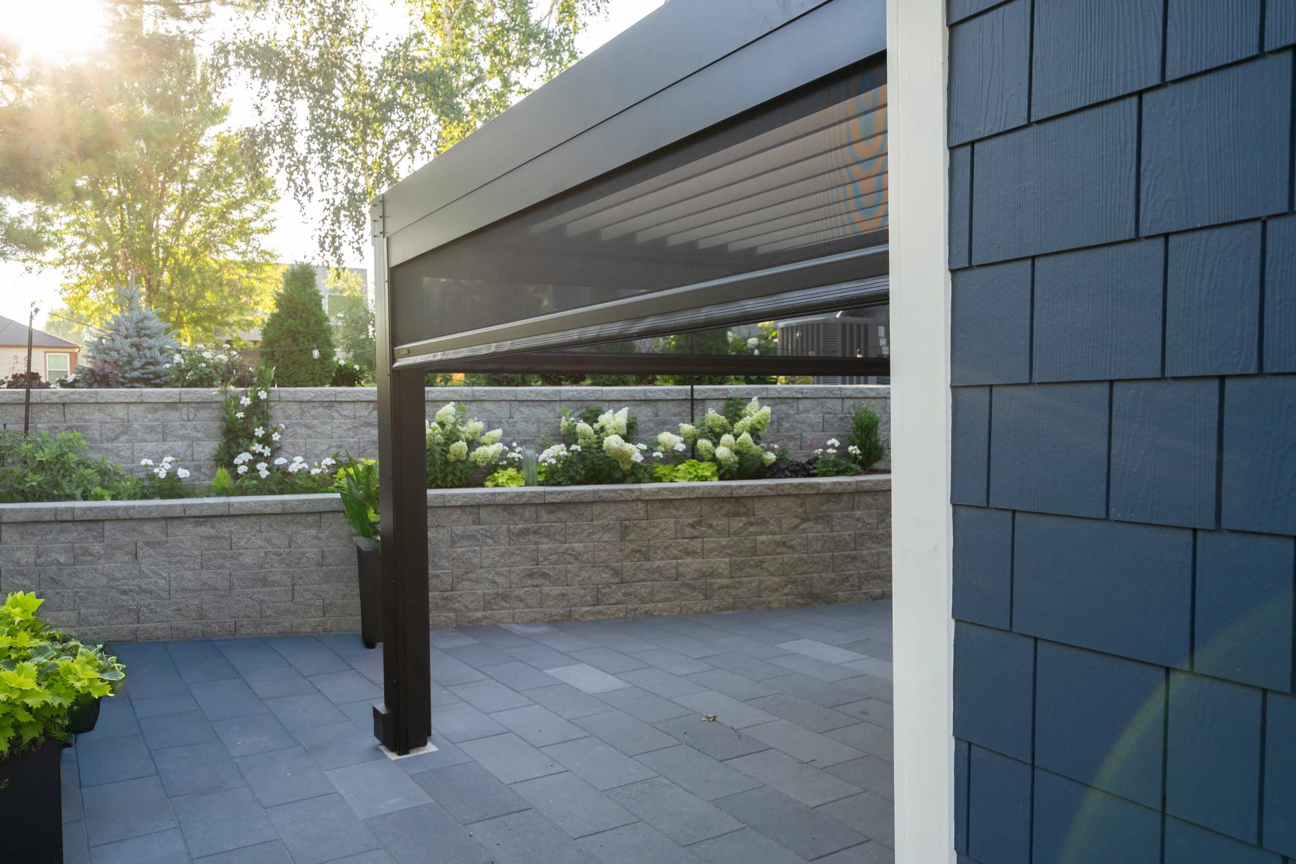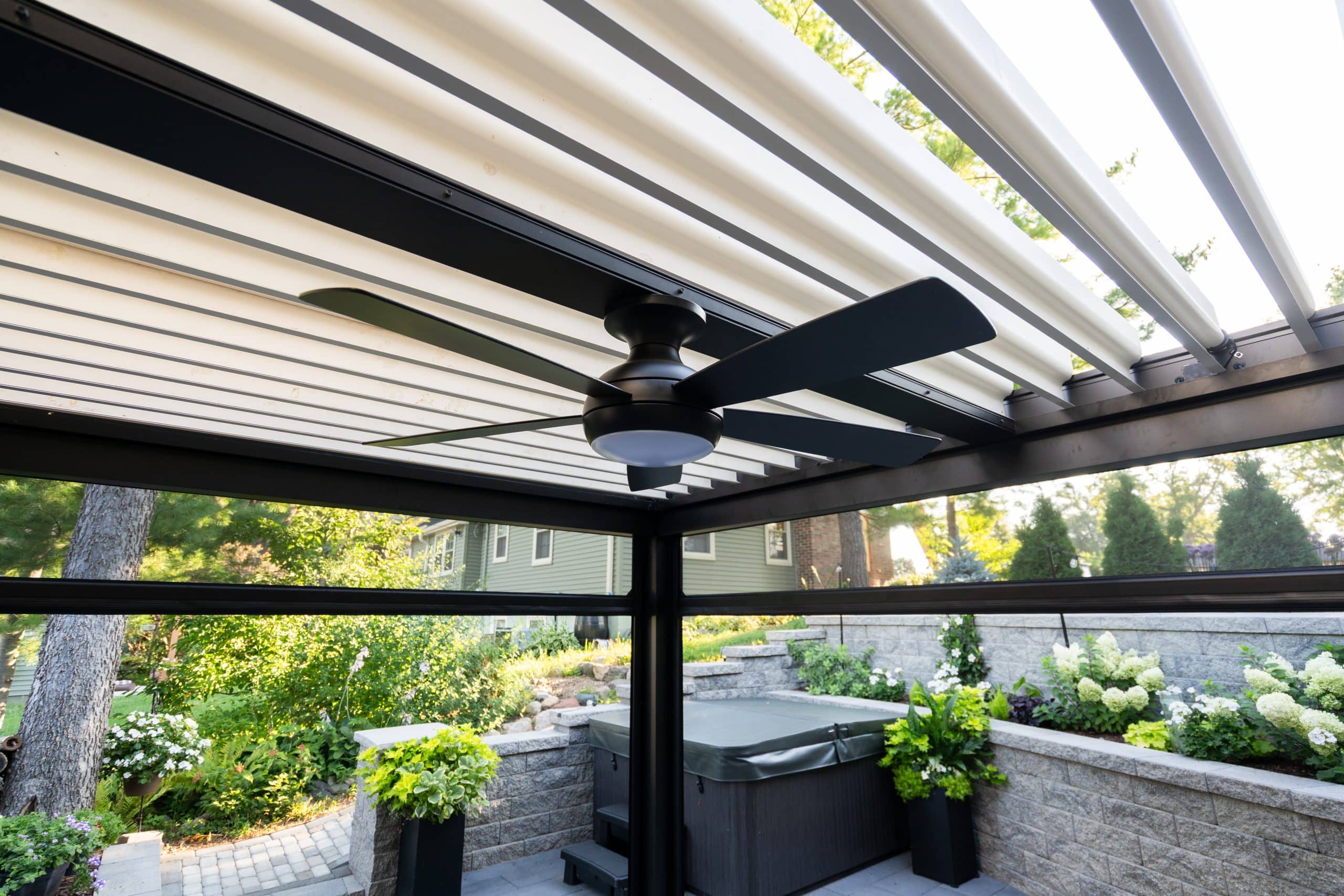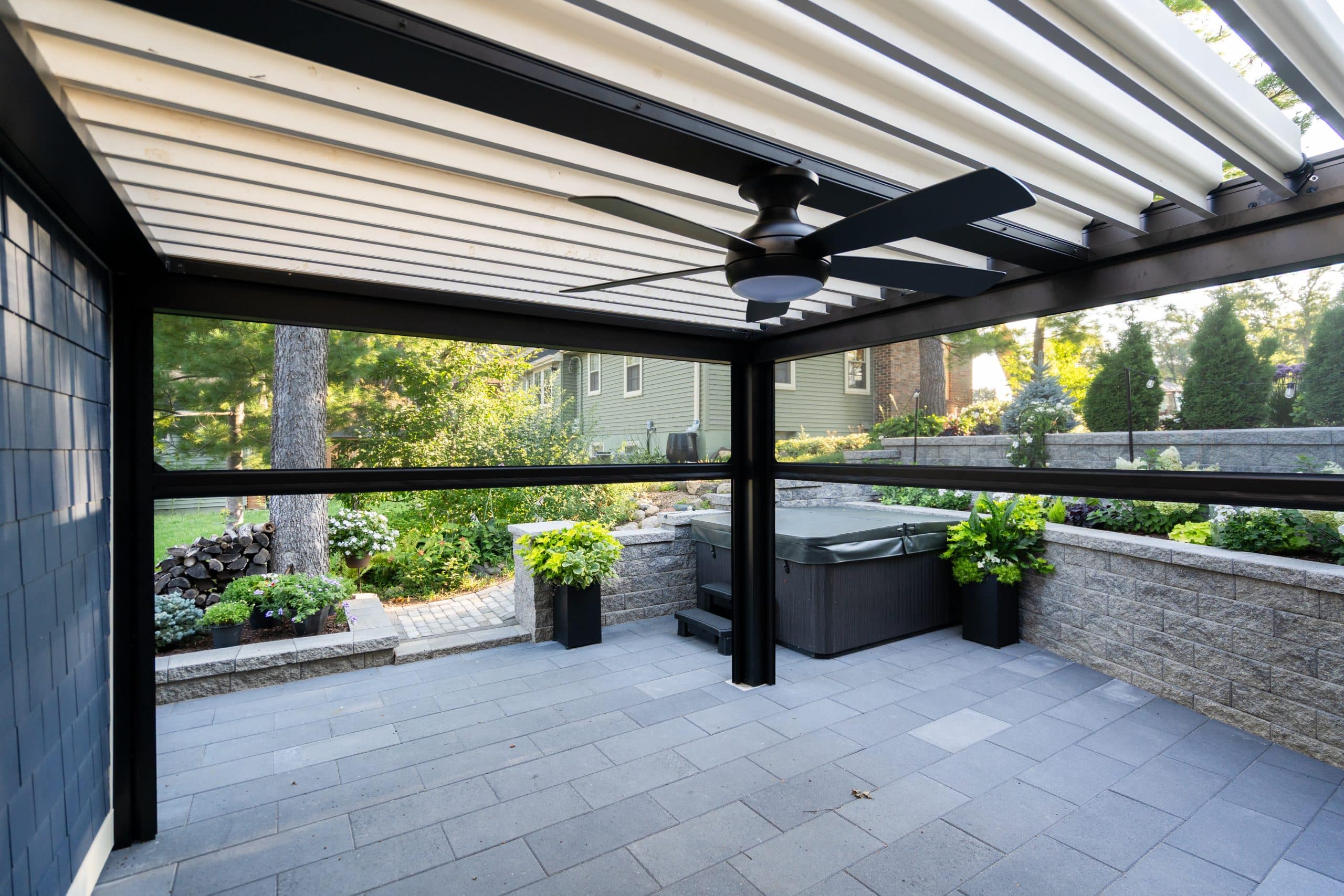 Extending off of the back of an existing structure, contrasting louvers and framing work into the overall aesthetic of the house. Retractable screens allow for complete blocking of rain and wind while allowing for flexibility for the space.