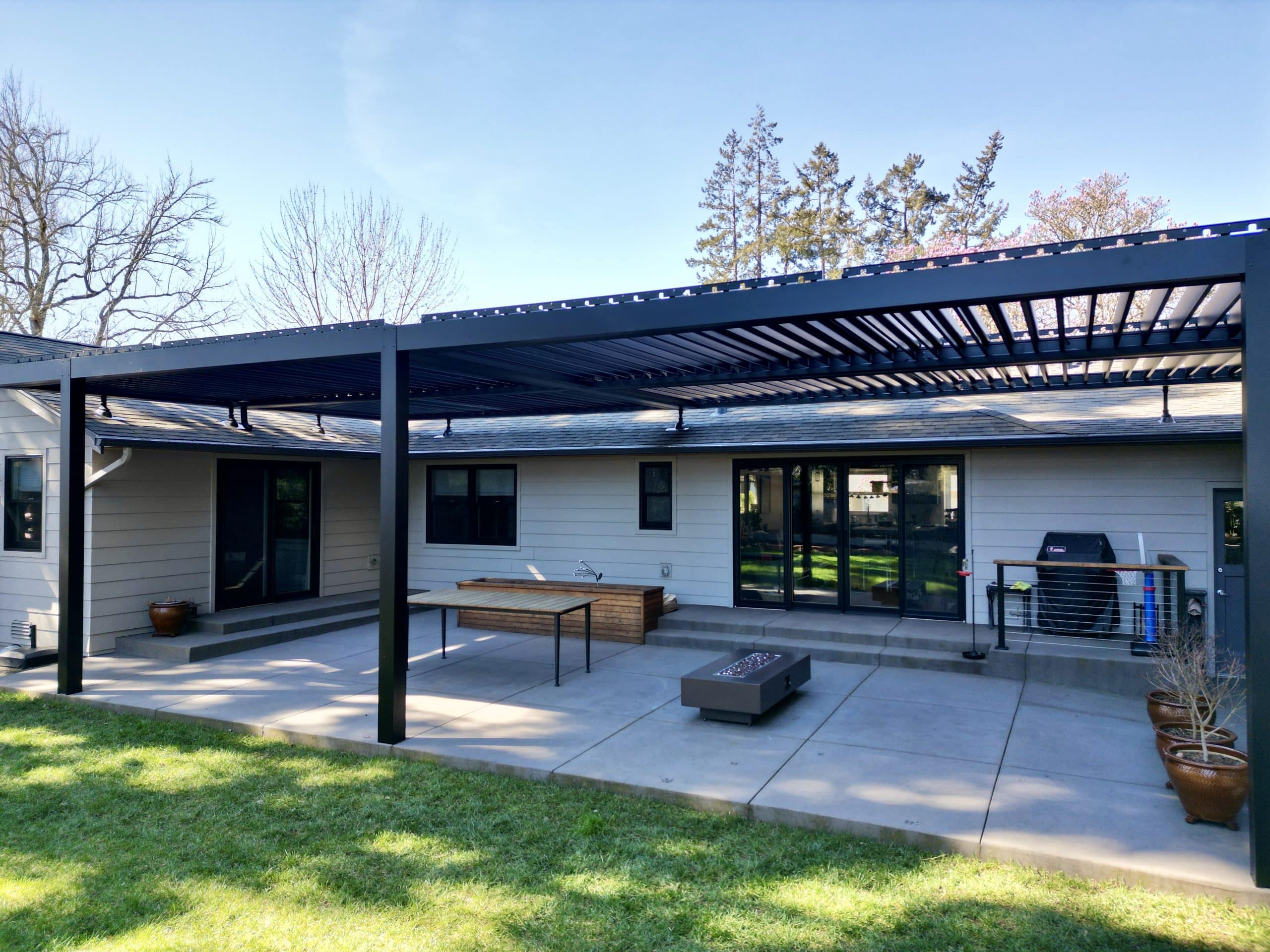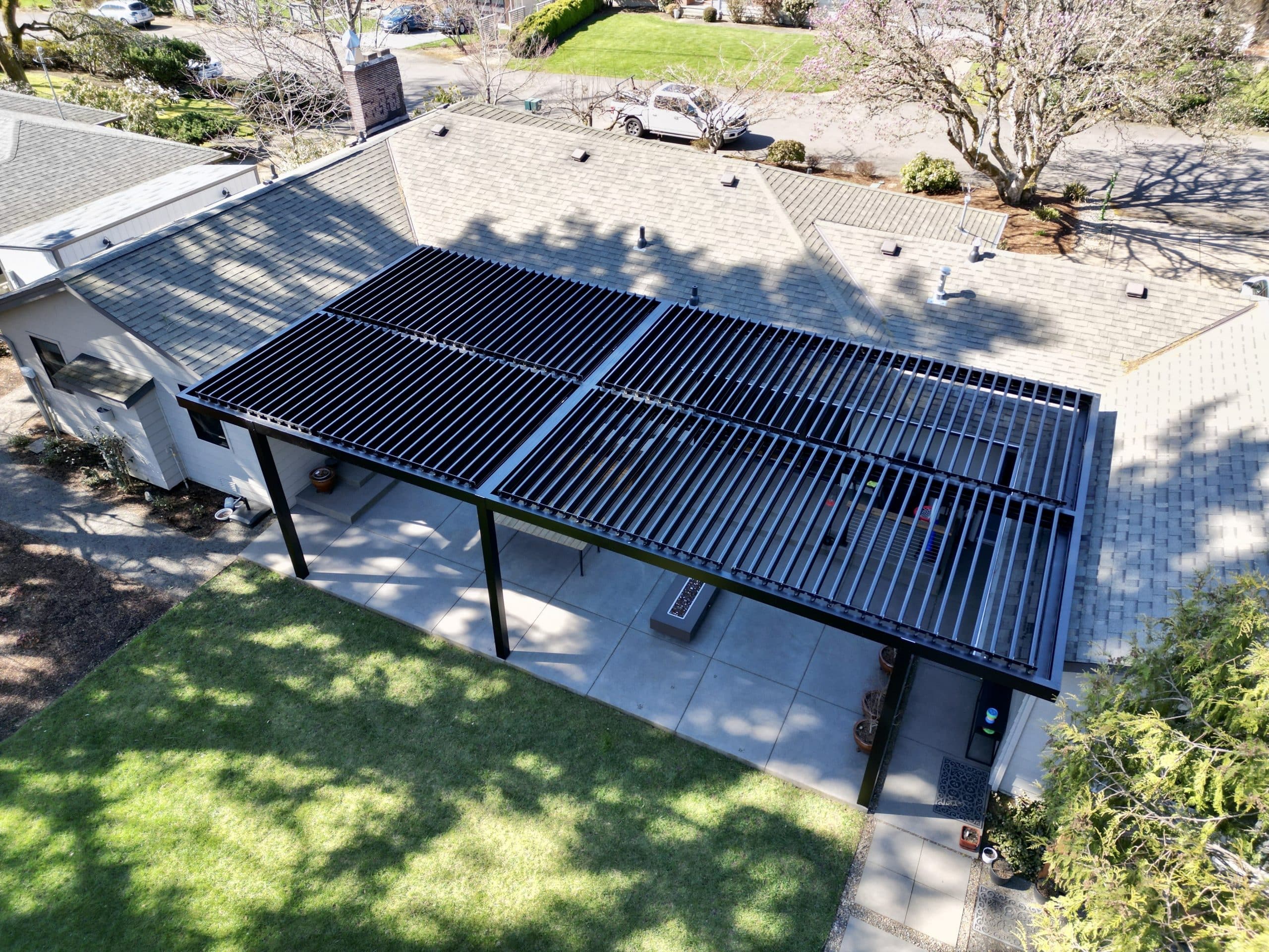 This Louvered Pergola was built with long spans covering a large protected space spanning the length of the home.