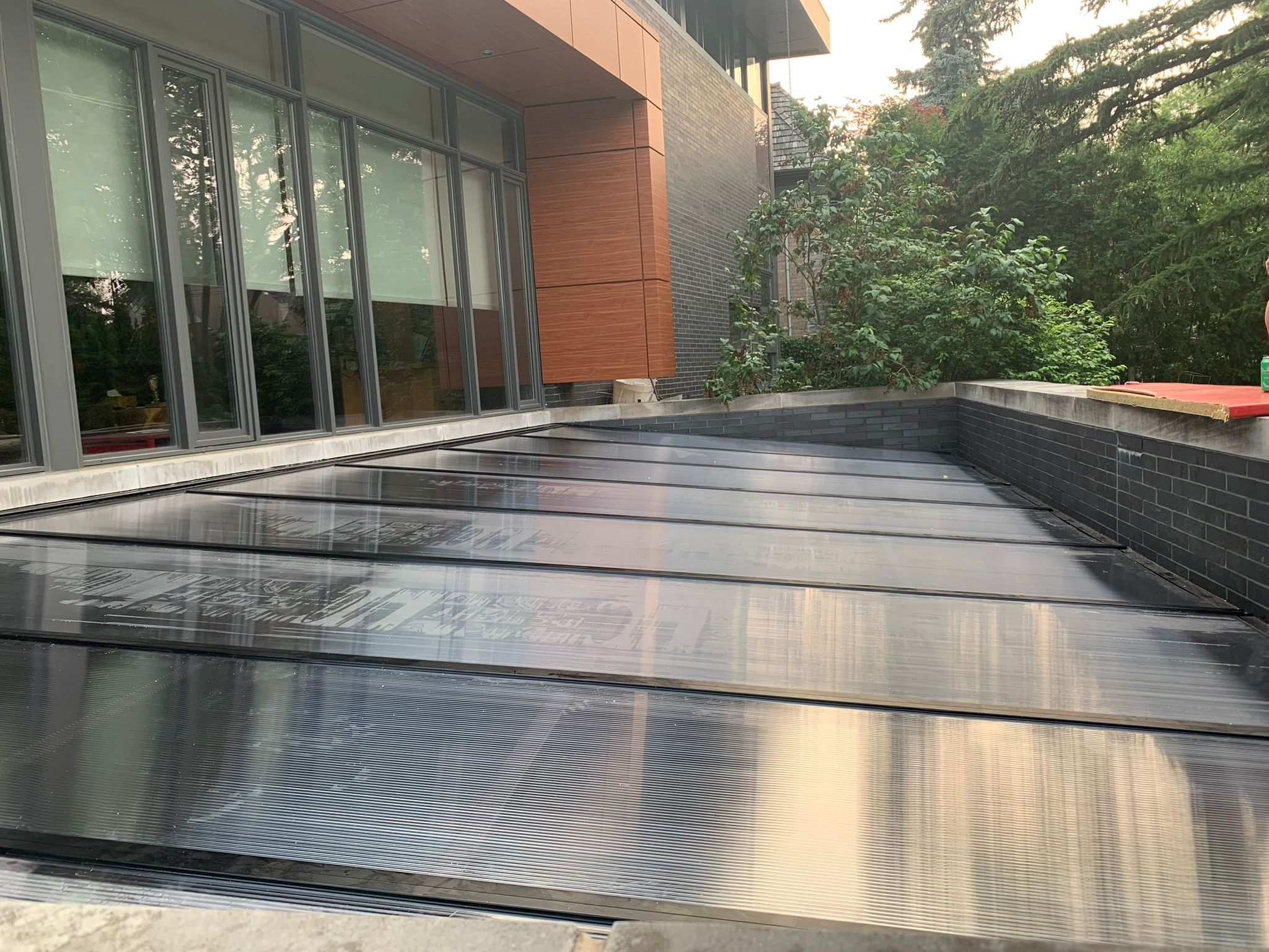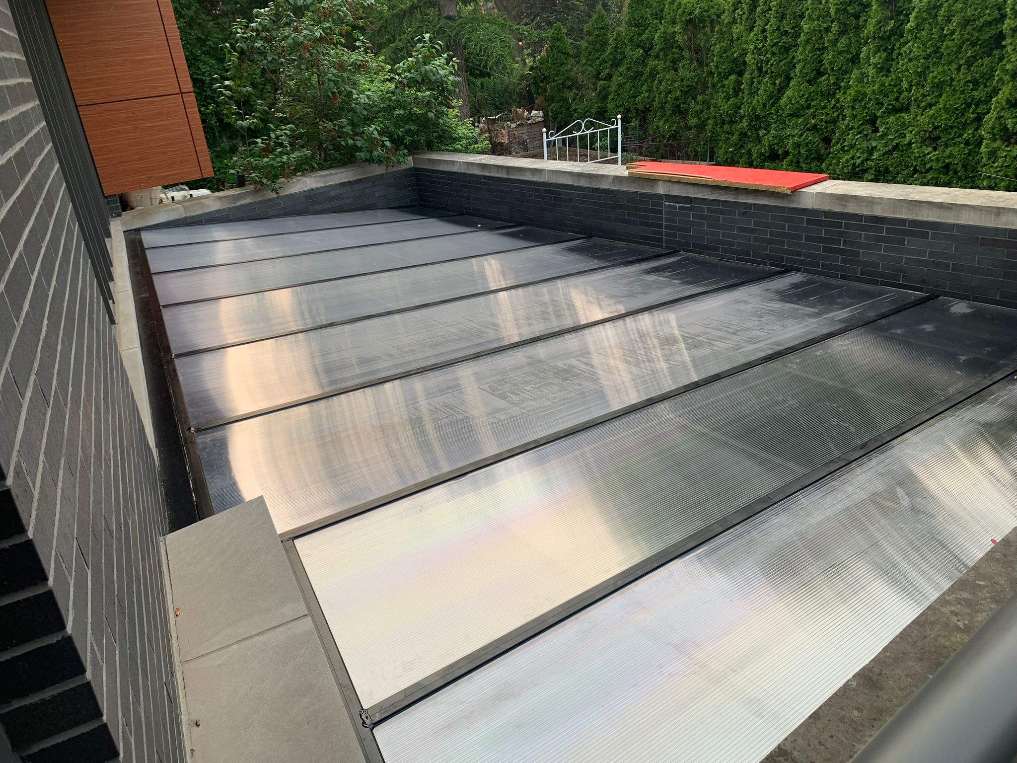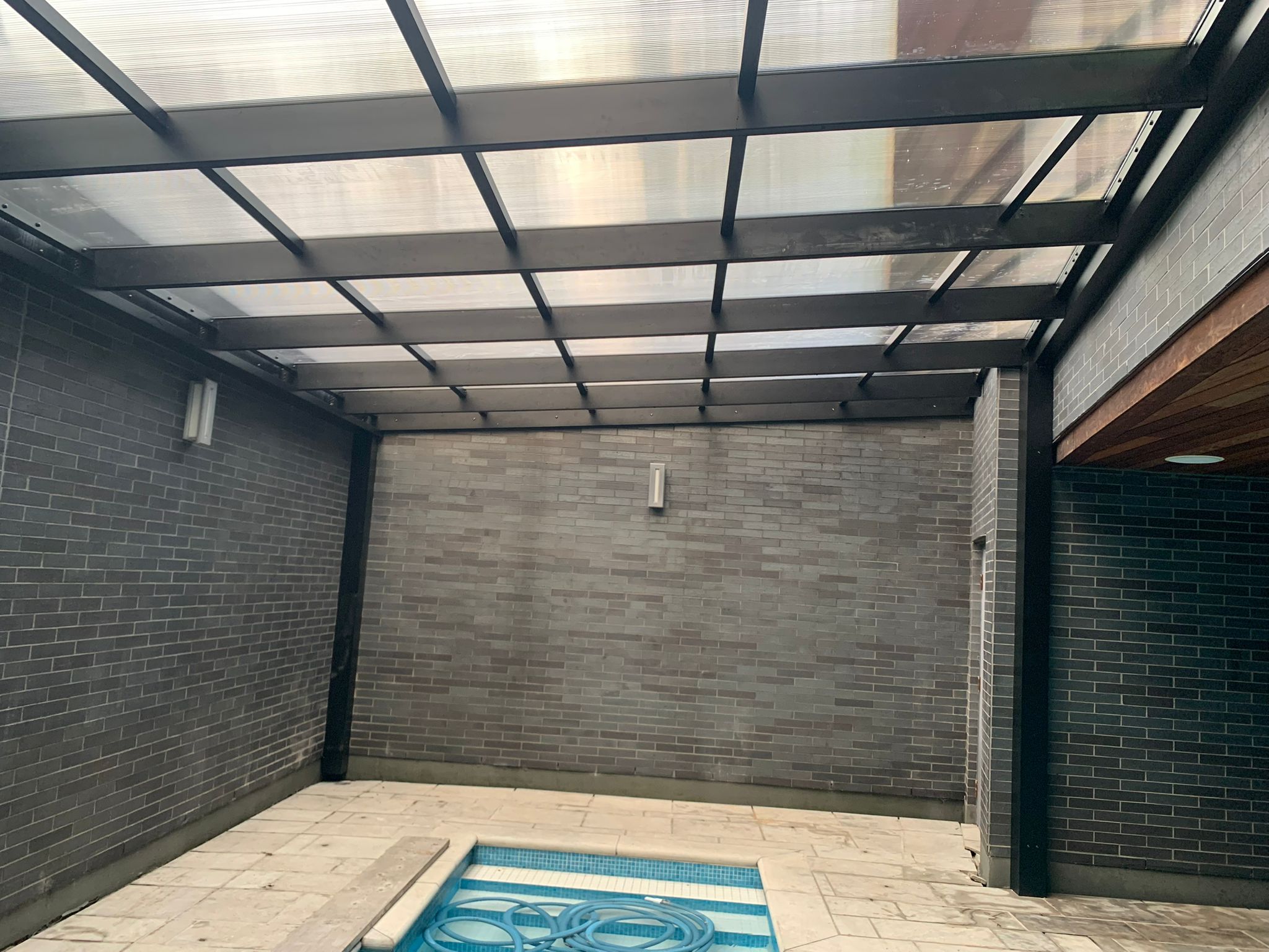 The Theilmans came to Rory with a unique design request; they wanted to enclose their outdoor pool area and make the space usable in the winter months. The other interesting element was to make the structure fit seamlessly into their modern Frank Loydd Wright inspired home. 2 spaces had to be covered; one side was enclosed using our polycarbonate roof to allow as much natural light into the pool area as possible while on