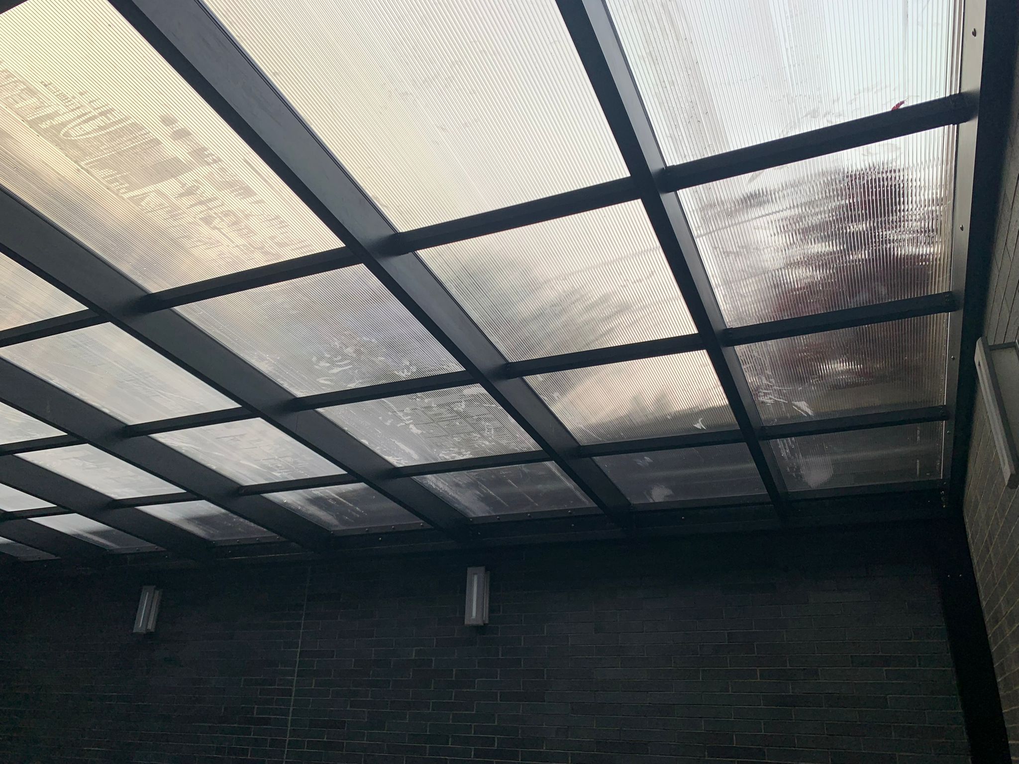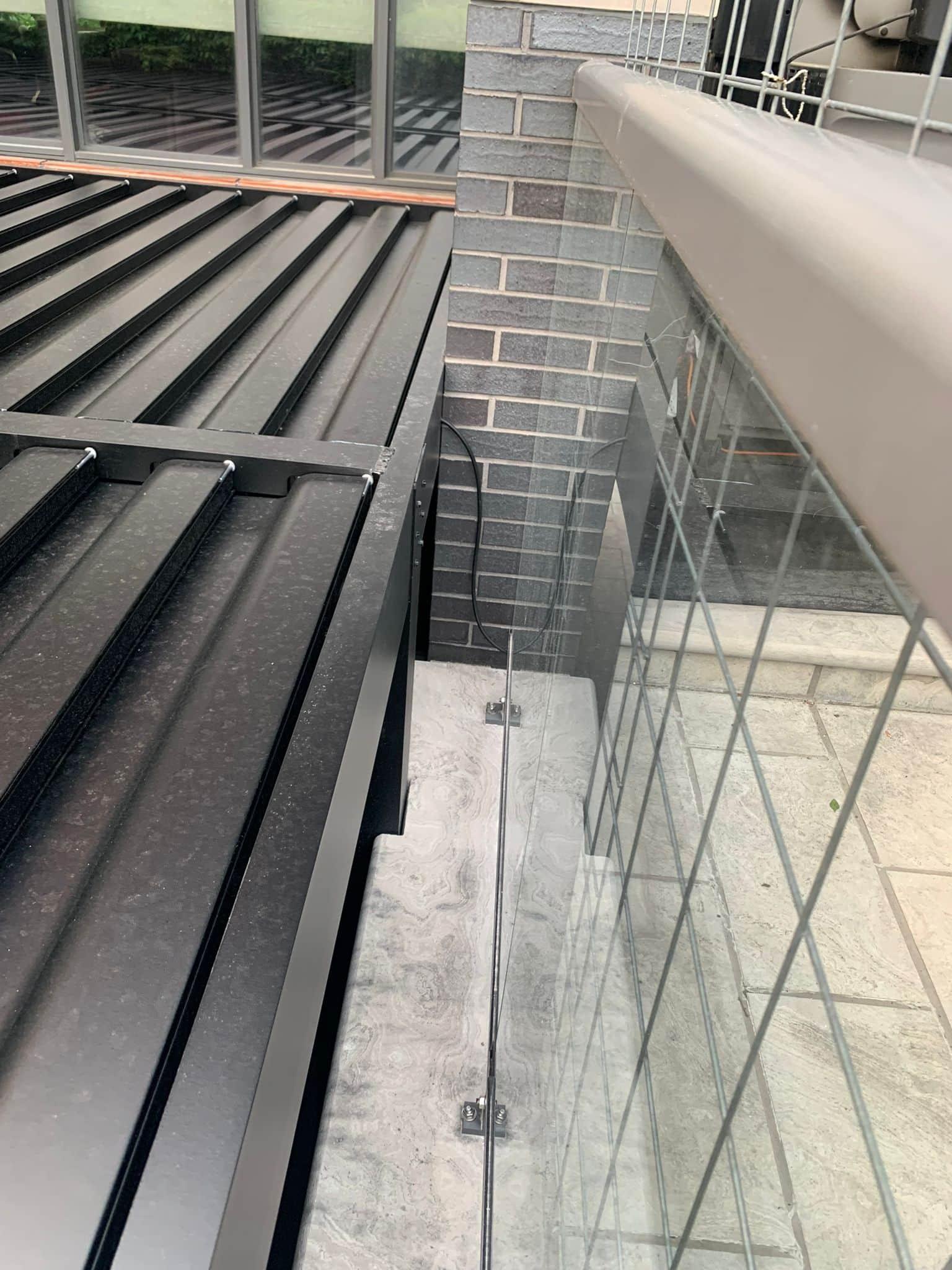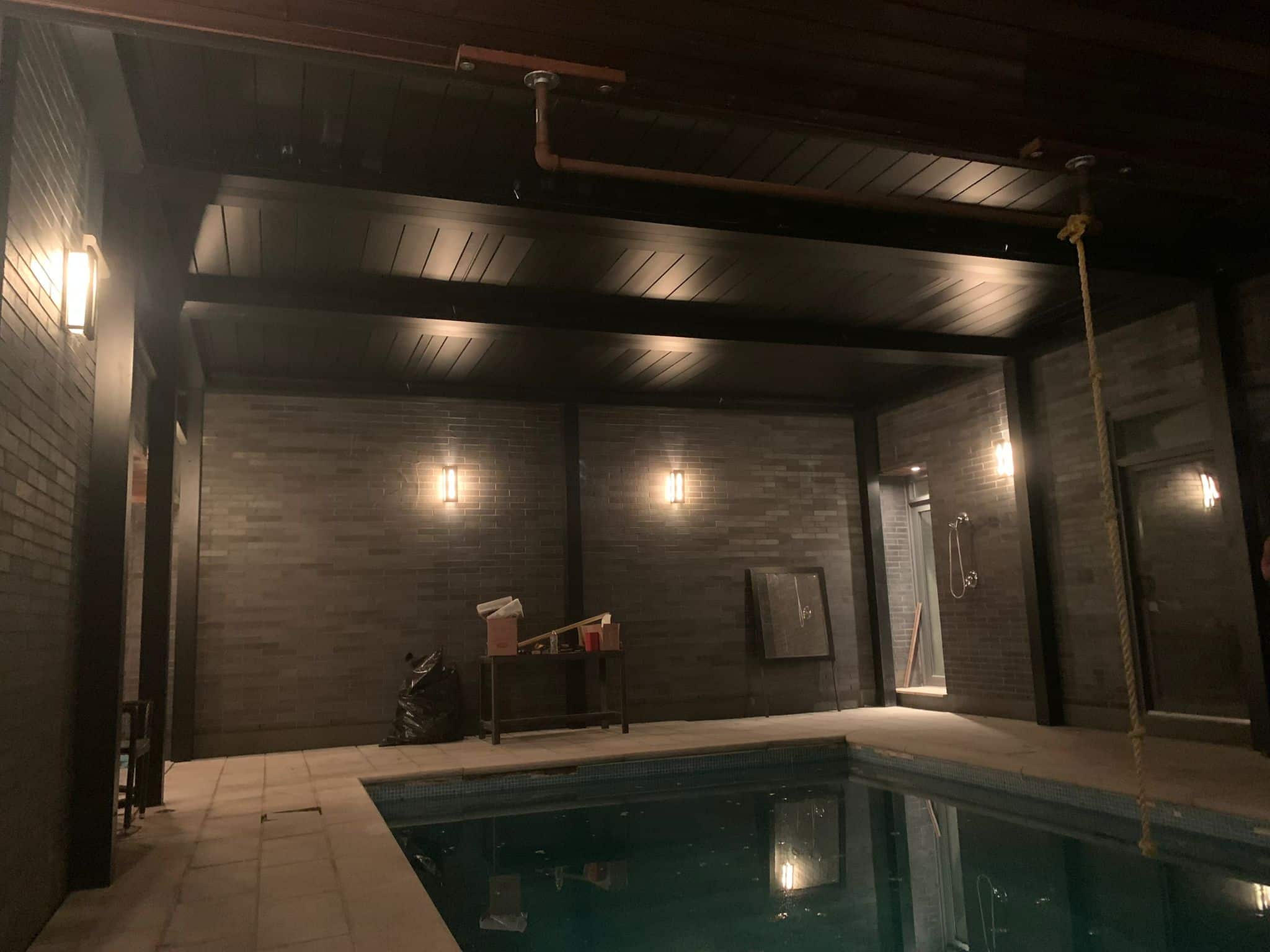 The Theilmans came to Rory with a unique design request; they wanted to enclose their outdoor pool area and make the space usable in the winter months. The other interesting element was to make the structure fit seamlessly into their modern Frank Loydd Wright inspired home. 2 spaces had to be covered; one side was enclosed using our polycarbonate roof to allow as much natural light into the pool area as possible while on