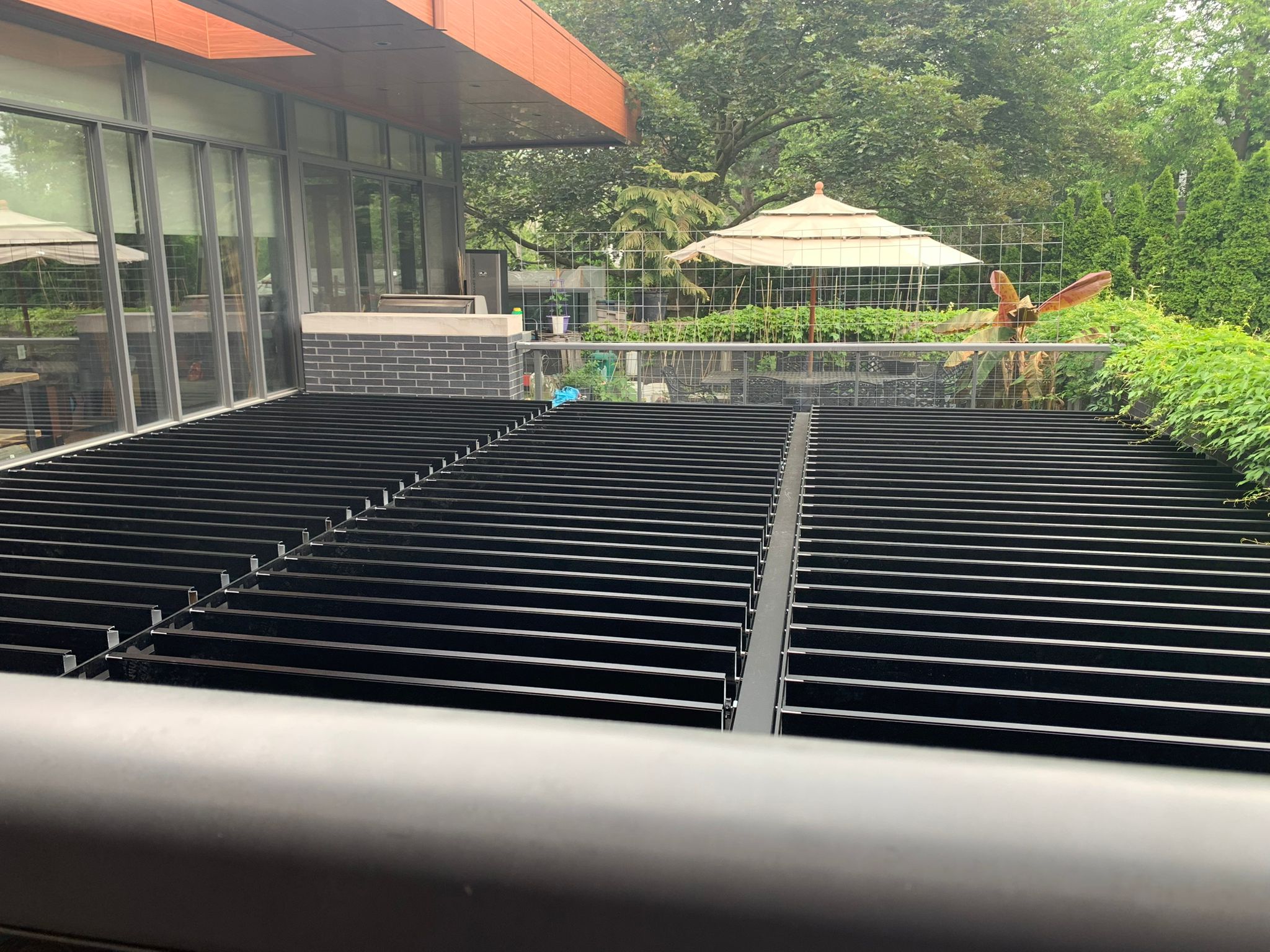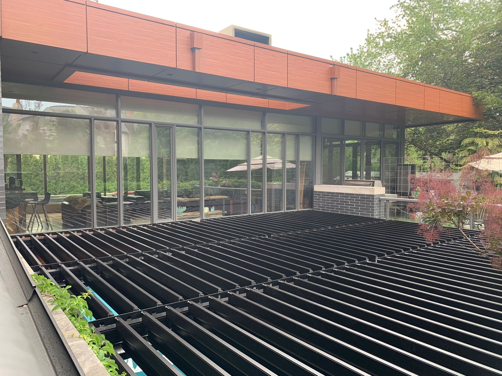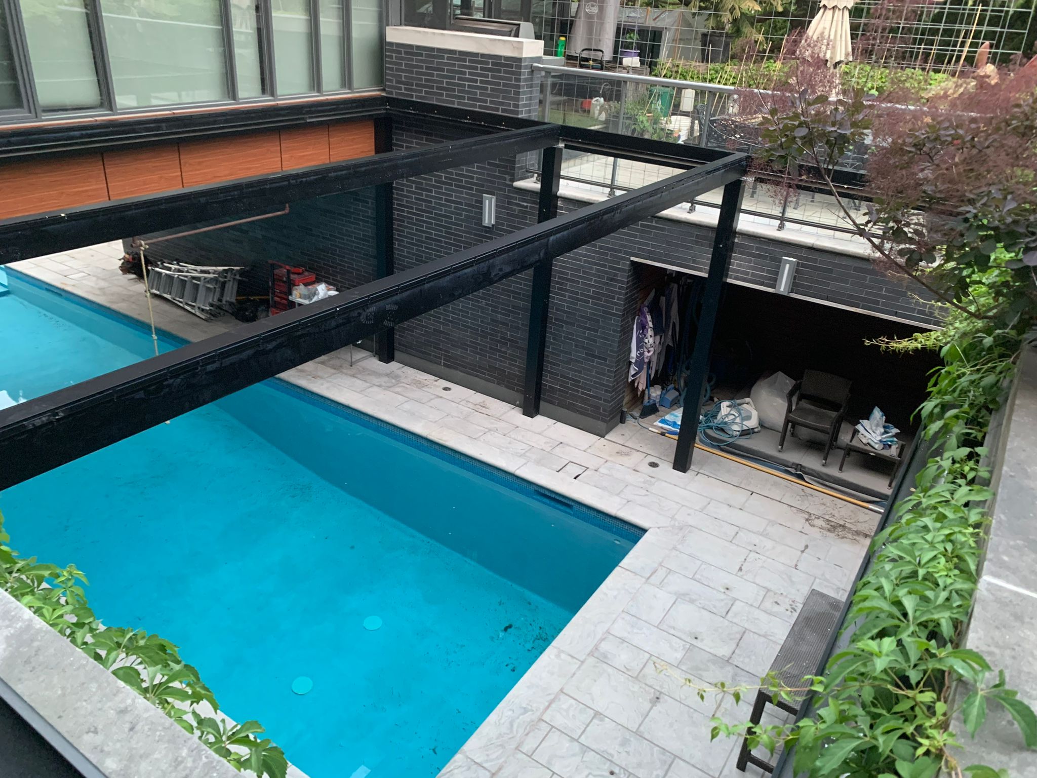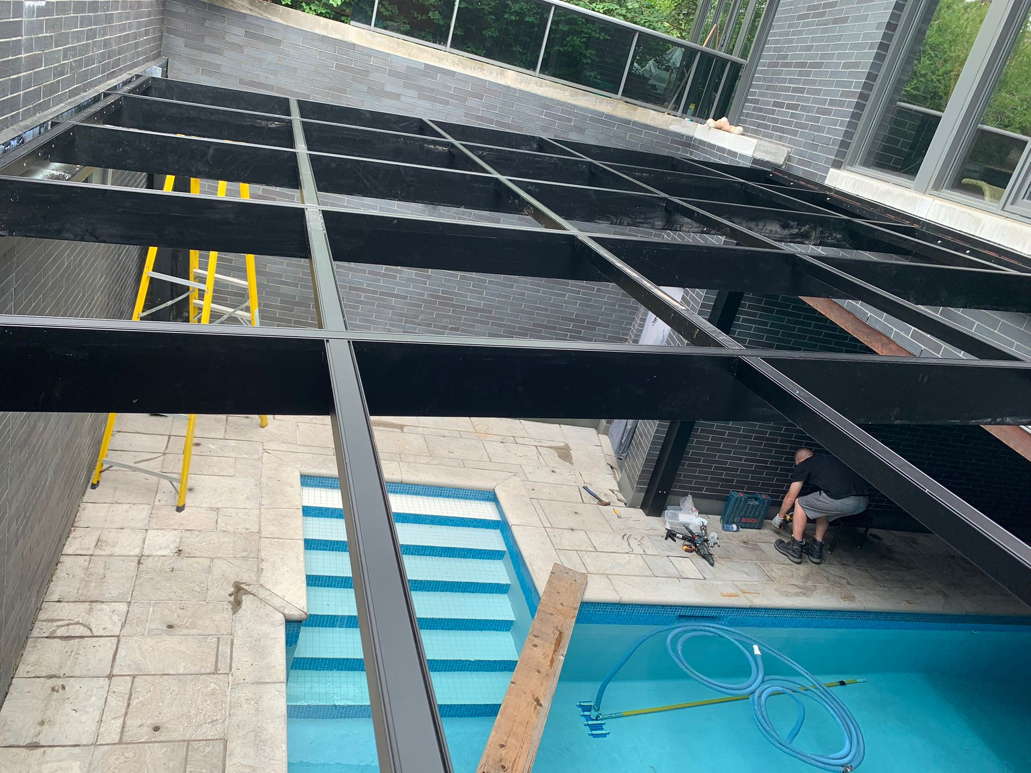 the other side our louvered roof was installed. The most obvious challenge for this build was the construction of the structure over an active pool. Both roof systems had to blend into the home in their own unique way to allow for the seamless look that always belonged there.