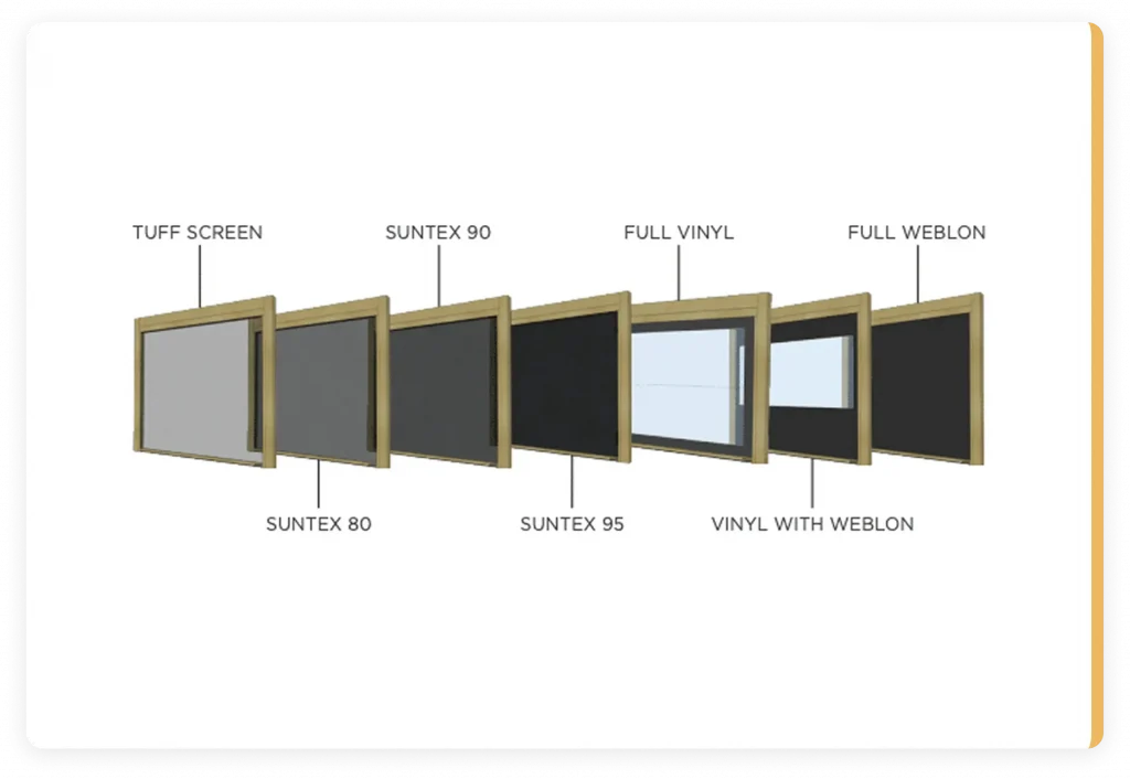 The choice of screen density primarily depends on its intended utility. Opt for a lower density mesh for effective bug protection, while a higher density is ideal for deflecting wind, providing privacy and sun protection. Certainly, privacy considerations may also influence your selection. Apart from mesh, our vinyl screens serve as an excellent choice for residential applications, especially for those aiming for 3-Season operation.